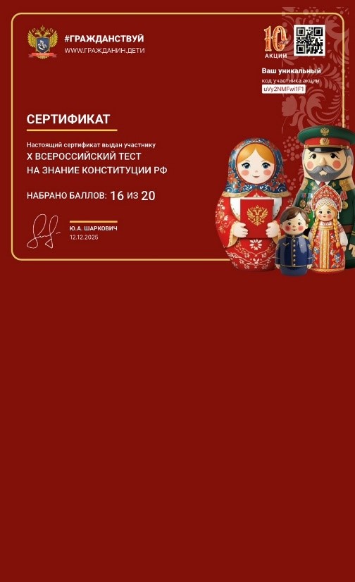 Students of the "Jurisprudence" course also took part in the X All-Russian test on knowledge of the Constitution of the Russian Federation. In an online format, the students answered questions related to the content of the Basic Law of the country. This annual action, conducted by the All-Russian public movement "Citizen", is aimed at motivating people to study the Russian civil system and fulfill their constitutional duties.
